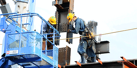 高層ビルなどで、タワークレーンを使い、人間でいうと骨組みになる鉄骨を吊り上げ、組み立てていきます。当然安全に十分配慮した形ですが、高所での作業を行います。「鉄骨建方」と呼びます。安全のためのネットや安全帯の設備の設置も同時に行っていきます